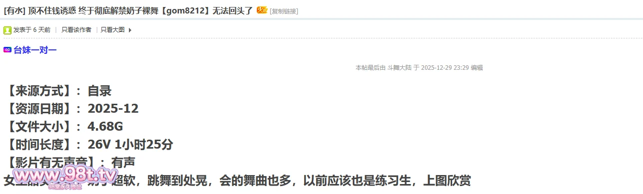 【资源名称】: 顶不住钱诱惑 终于彻底解禁奶子裸舞【gom8212】无法回头了